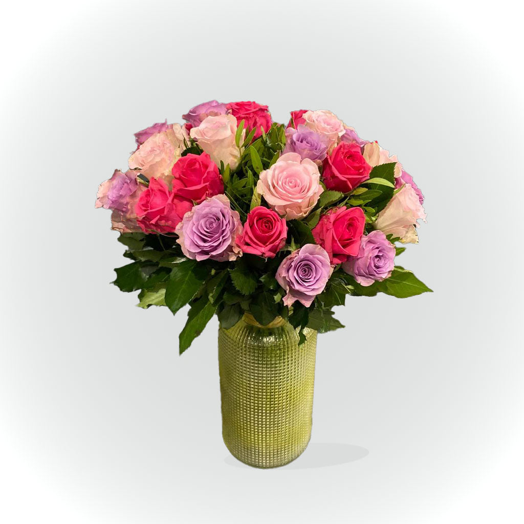 Bouquet de roses composé de roses parme, fuchia et de roses rose pâle et de feuillage.